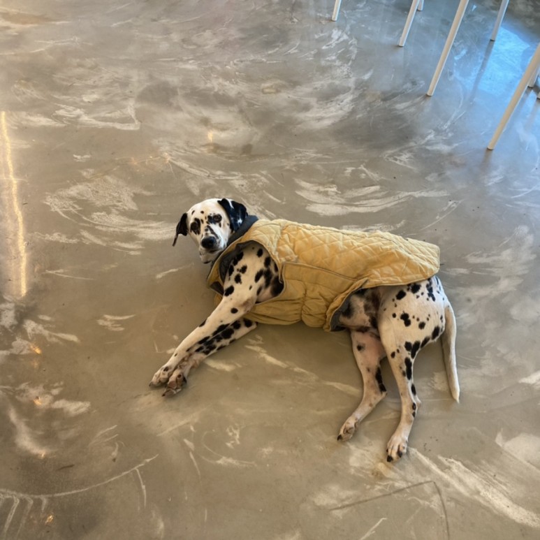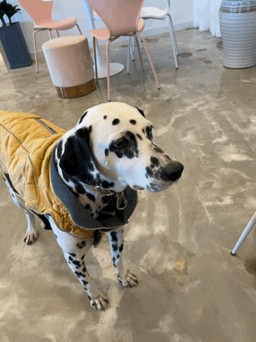 바로 눈치빠른 달마시안 별이가 와서 쳐다보니까 사장님 별이 입에 사과 하나 넣어주기