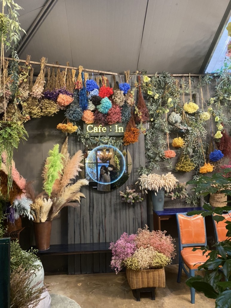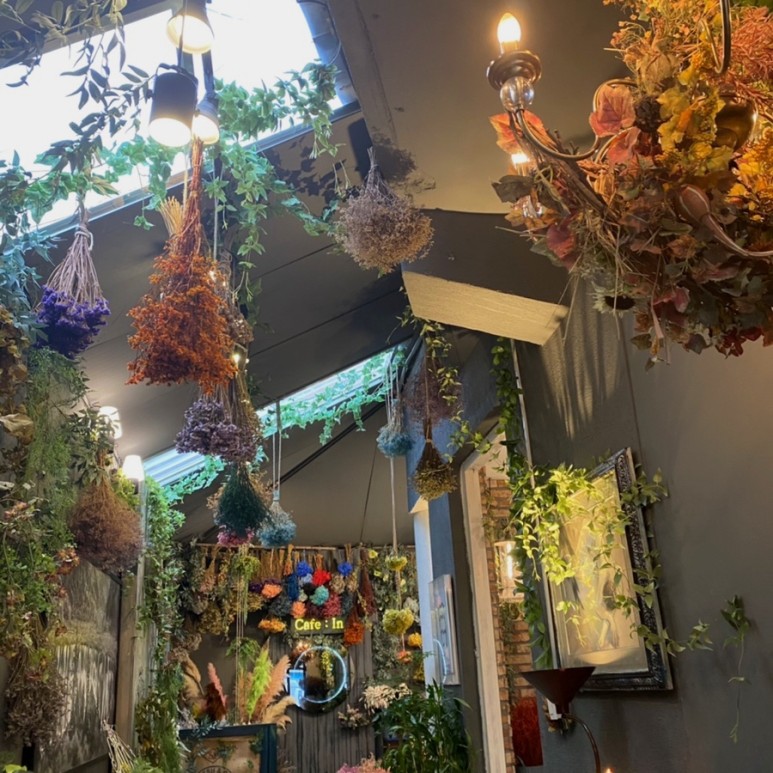 위쪽을 보면 드라이 플라워가 가득 매달려 있어요