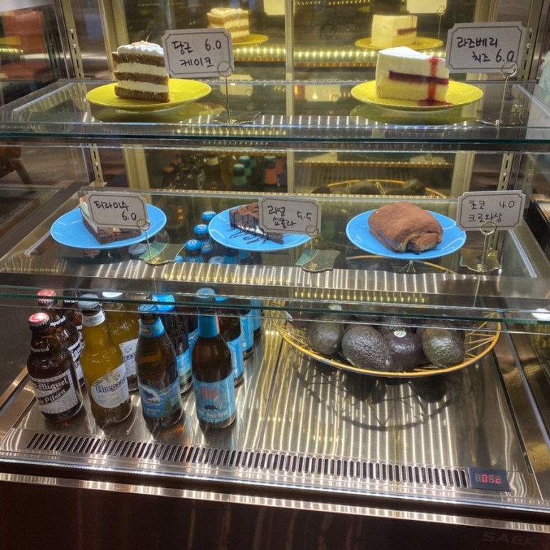 쇼케이스에는 케이스와 크로와상 맥주랑 아보카도가 있고